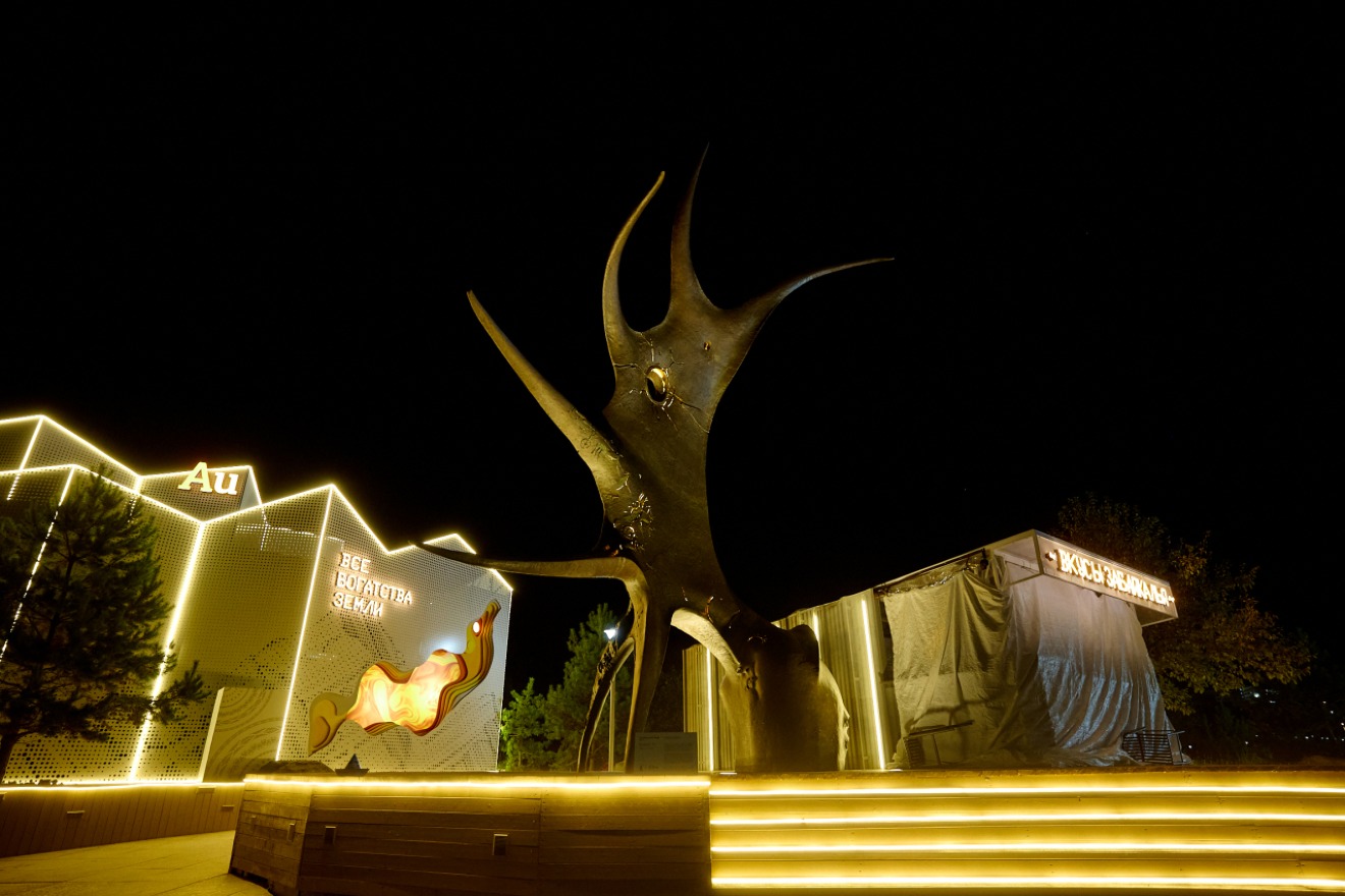 The work is dedicated to the theme of the cultural heritage of the region. The monument represents, in the style of an avant-garde art object, an artistic image of a mighty Siberian beast, an elk, a fragment of its huge spreading horns forming a shining "sunny" halo around the through holes in them.