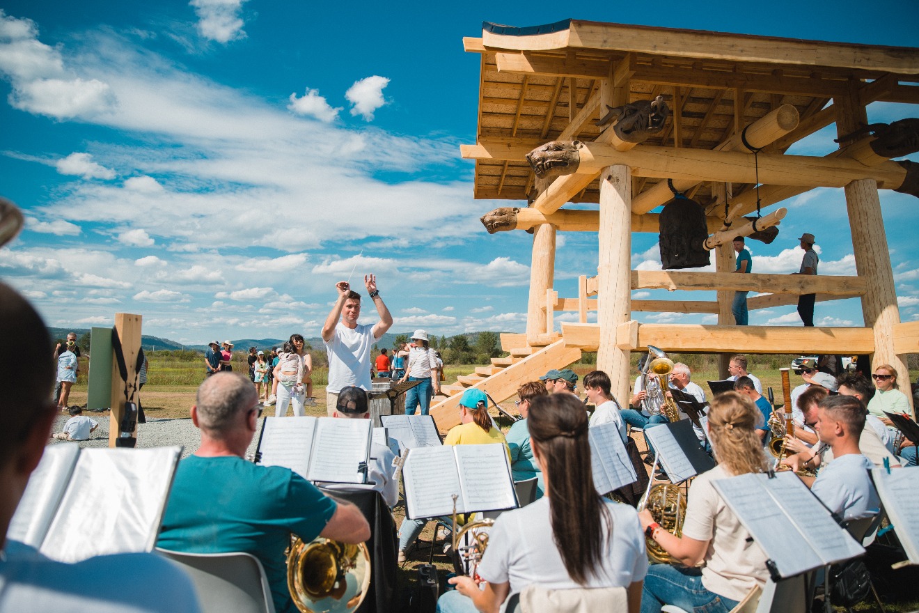 An evening performance of the orchestra was planned near the new facility. The guests were sitting on the ground: some on a large blanket, some just on the green soft grass. The brass band concert sounded impressive under the open, clear sky. The musicians performed a new composition by Bair Dondokov, created for the orchestra, and dedicated to Dasha Namdakov's work "Khan darkhanai honkho". The artists played not only instruments, but also the bell itself. Even hammers and anvils were used, and the ringing of the bell became the culmination of the second part of the performance.
